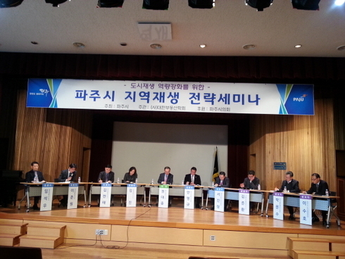세미나는 이수호 파주시 도시재생과장의 ‘파주시 도시와 농촌의 현 실태와 과제’, 박문수 한미글로벌 상무의 ‘도시재생 사업의 방향과 과제’, 김준환 서울디지털대학교 교수의 ‘농촌마을 활성화 전략’ 등 주제발표로 진행됐다. 이어 종합토론은 권대중 명지대학교 교수가 좌장으로 서진형 대한부동산학회 교수, 안명규 파주시의회 부의장 등 도시재생 전문가의 열띤 토론으로 진행됐다.