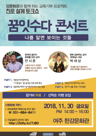 특히, 꿈잇수다의 대표명사로 초청된 한국갭이어 안시준 대표와 함께 나를 알아가는 방법에 대해 배우고, 나를 알면 보이는 지역, 사회, 문화, 예술, 환경 관련 진로에 대해서도 각 분야의 멘토들과 직·간접적으로 체험할 수 있는 시간을 가질 예정이다. 아울러 꿈잇수다 콘서트 중 최고의 질문을 한 참가자를 대상으로 명사의 사인이 담긴 저서를 선물하는 이벤트도 진행하며, 문의·접수는 한강문화관 안내데스크로 하면 된다.