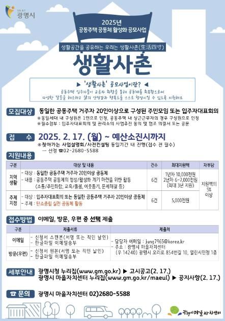 한편, 광명시 마을자치센터는 사업에 대한 자세한 설명을 원하는 공동주택에 직접 찾아가 사업설명회를 개최해 사업 방향성, 사업계획서 작성법 등을 안내할 계획이다.