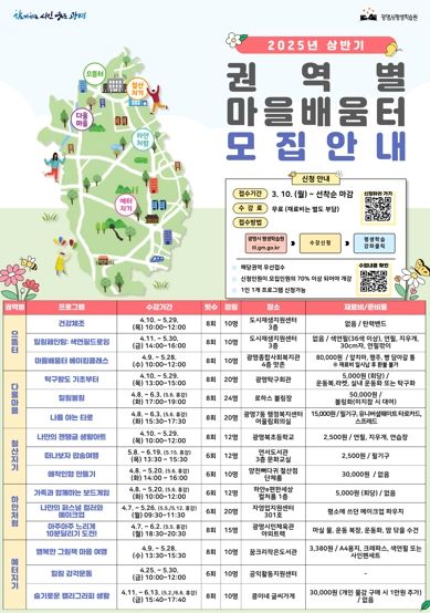 (비전21뉴스) 광명시는 오는 10일부터 25일까지 2025년 상반기 평생학습 권역별 마을배움터 프로그램 학습자를 모집한다.