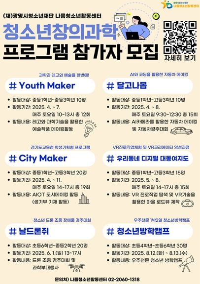 이번 청소년창의과학 프로그램은 광명시 초등학교 고학년 및 중·고등학생을 대상으로 하며, 참가 신청 방법 및 프로그램에 대한 자세한 내용은 포스터에 기재된 QR코드 링크를 통해 확인할 수 있다.