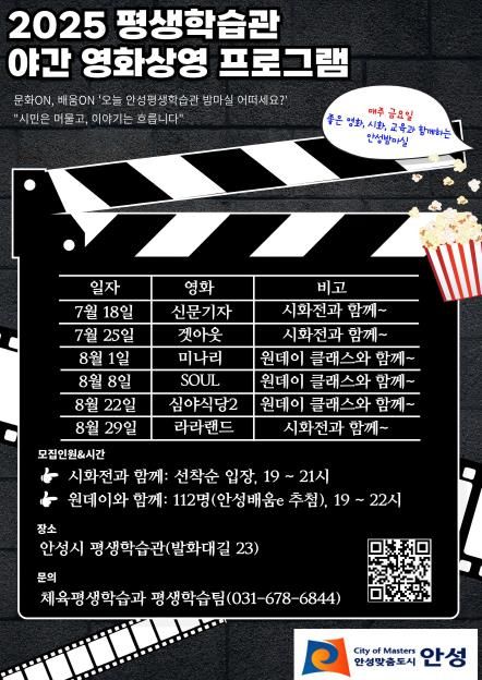 (비전21뉴스) 안성시는 하절기 무더위 쉼터 기능과 연계하여, 오는 18일부터 6주간 매주 금요일 오후 7시부터 9시까지 안성시 평생학습관에서 야간 영화 상영 프로그램을 운영한다. 이번 프로그램은 문화 향유와 배움이 어우러지는 시민 휴식 공간으로서 평생학습관의 기능을 강화하고, 무더운 여름밤 시민들에게 쉼과 즐거움을 제공할 예정이다.