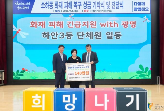 (비전21뉴스) 광명시 하안3동 각 단체와 기관단체협의회는 지난 2일 광명시청 대회의실에서 소하동 화재 피해 가구의 복구 지원을 위해 성금 140만 원을 광명시사회복지협의회에 전달했다.
