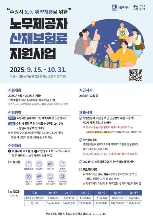 (비전21뉴스) 수원시는 10월 31일까지 ‘2025년 하반기 노동 취약계층 노무제공자 산재보험료 지원사업’ 신청을 받는다.