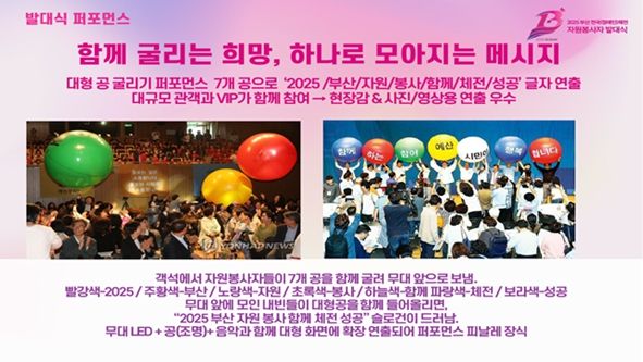 자원봉사자들이 객석에서 7개의 공을 무대 앞으로 굴려 배치하고, 내빈들이 손을 대면 ‘2025 부산 자원봉사 함께 체전 성공’이라는 슬로건이 펼쳐져, 모두가 힘을 모아 성공 체전을 만들어 간다는 상징적 메시지를 전한다.