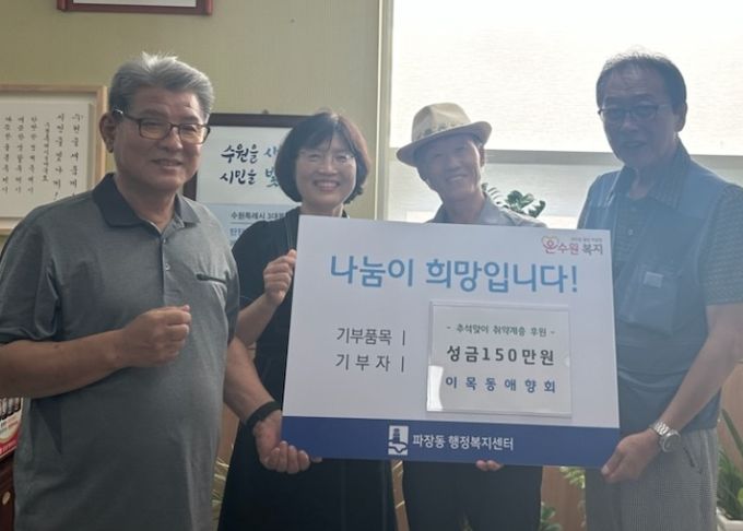 (비전21뉴스) 수원시 장안구 파장동은 지난 18일, 이목동 애향회에서 추석을 맞이하여 홀로 계신 어르신과 저소득 취약계층 등 소외된 이웃들에게 힘이 되고자 성금 150만원을 기부했다고 밝혔다.