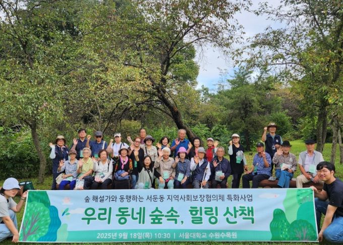 (비전21뉴스) 수원시 권선구 서둔동 지역사회보장협의체는 지난 18일, 관내 어르신 20명을 모시고 서울대농대 수원수목원에서‘우리 동네 숲속, 힐링 산책’숲 체험 나들이를 진행했다.