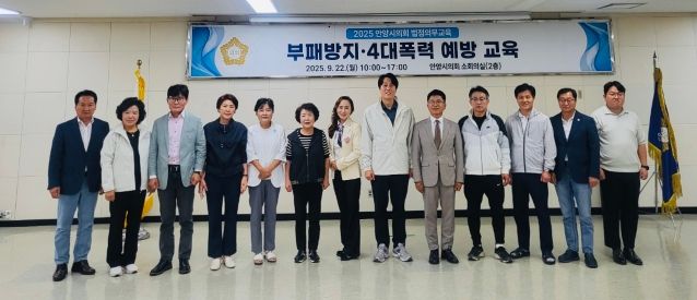 (비전21뉴스) 안양시의회는 지난 22일 시의회 소회의실에서 시의원과 사무국 직원을 대상으로 ‘부패방지 및 4대폭력 예방 교육’을 진행했다. 이번 교육은 법정의무교육으로, 청렴 의식 함양과 4대폭력(성희롱, 성폭력, 성매매, 가정폭력)에 대한 예방 의식 고취를 위해 마련됐다.