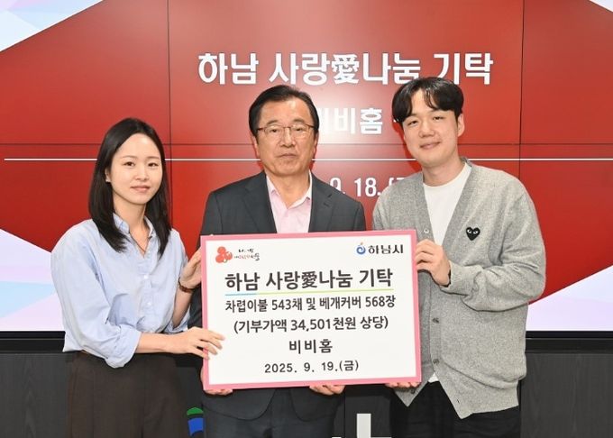 (비전21뉴스) 지난 19일, 침구 제조·판매업체 비비홈은 하남시 관내 어려운 이웃들을 위해 차렵이불 543채, 베개커버 568장 (34,501천원 상당)을 기탁하며 기탁식을 가졌다.