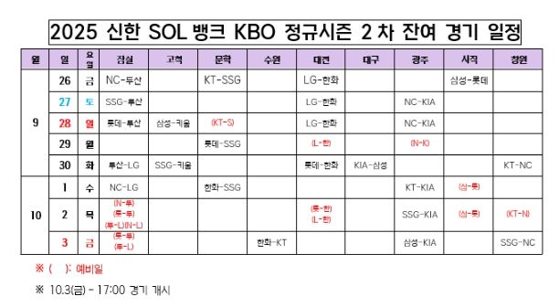 (비전21뉴스) KBO는 26일(금) 2025 신한 SOL뱅크 KBO 정규시즌 2차 잔여 경기 일정을 확정했다.