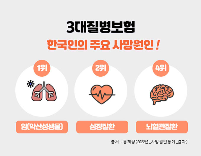 (비전21뉴스) 3대질병으로 일컬어지는 암, 뇌혈관질환, 심혈관질환은 한국인의 주요 사망원인에서 상위를 차지하고 있으며, 이에 대한 진단비를 집중적으로 보장해 주는 보험상품을 3대질병진단비 보험이라 할 수 있다.
