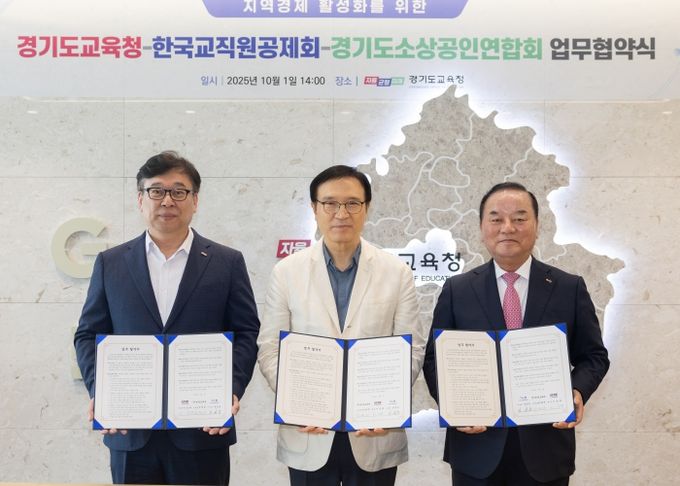 (비전21뉴스) 경기도교육청이 1일 남부청사에서 경기도소상공인연합회, 한국교직원공제회와 ‘지역경제 활성화를 위한 상생 업무협약’을 체결했다.