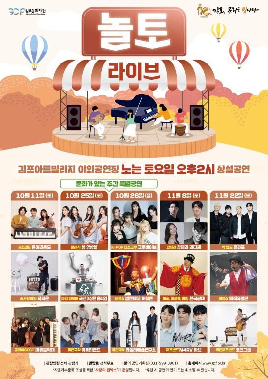 (비전21뉴스) (재)김포문화재단은 10월 11일부터 11월 22일까지 매월 둘째, 넷째 주 토요일마다 김포아트빌리지 야외공연장에서 하반기 토요상설공연 '놀토 라이브'를 개최한다고 밝혔다.