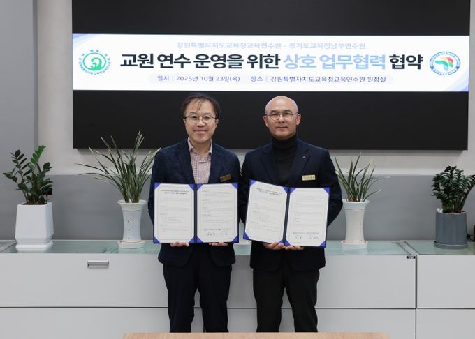 강원특별자치도교육청교육연수원에서 진행된 이번 업무협약에는 심한수 경기도교육청남부연수원장과 민섭 강원특별자치도교육청교육연수원장이 참석해 인적·물적 자원을 공유하여 연수 기획력과 실행력을 높이는 데 공동의 노력을 기울일 것을 약속했다.