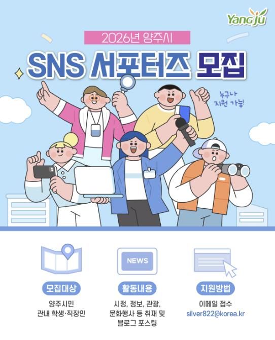 (비전21뉴스) 양주시가 시민과 소통하며 시정 소식과 지역의 숨은 매력을 널리 알릴 '2026년 양주시 SNS 서포터즈'를 오는 12월 1일부터 10일까지 10일간 모집한다.