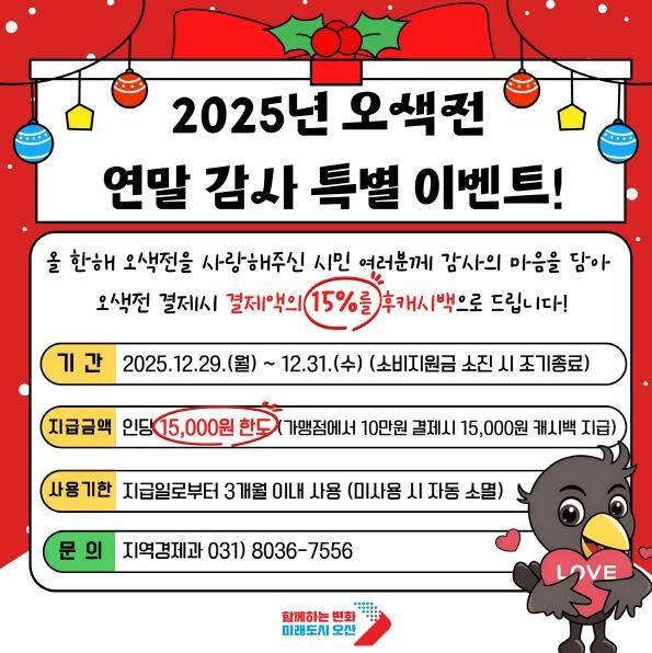 (비전21뉴스) 오산시는 한 해 동안 지역화폐를 이용해 준 시민들에게 감사의 뜻을 전하고, 연말 소비 활성화를 도모하기 위해 ‘2025년 오색전 연말 감사 특별 이벤트’를 추진한다.