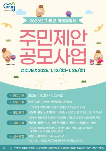 가평군 관계자는 “이번 공모사업을 통해 주민이 주체가 돼 마을의 문제를 해결하고, 공동체 활동을 통해 이웃 간 신뢰와 연대가 회복되길 기대한다”며 “관심 있는 주민과 공동체의 적극적인 참여를 바란다”고 말했다.