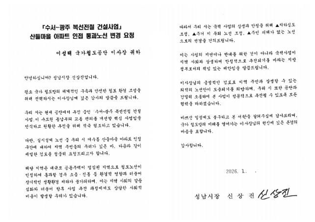 (비전21뉴스=정서영 기자) 성남시는 지난 16일 김윤덕 국토교통부 장관과 이성해 국가철도공단 이사장에게 ‘수서~광주 복선전철(이하 수광선) 건설사업’과 관련하여 여수동 산들마을 아파트 인접 통과 구간의 노선 변경을 요청하는 서한을 전달했다고 20일 밝혔다.