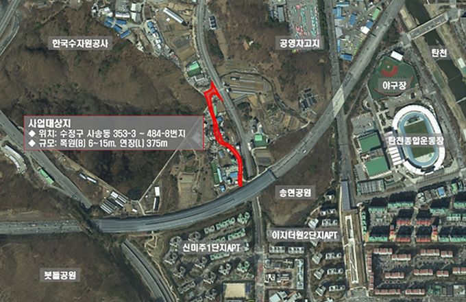 (비전21뉴스) 성남시 수정구 사송동 353-3번지~484-8번지 일원에 오는 2030년까지 375m 길이의 도로 개설 사업이 추진된다.