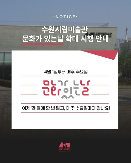 (비전21뉴스) 경기도 수원시립미술관은 4월 1일부터 ‘문화가 있는 날’ 운영을 기존 매월 마지막 주 수요일 1회에서 매주 수요일로 확대 운영한다.