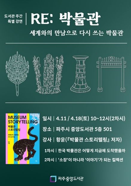 (비전21뉴스) 파주중앙도서관은 도서관 주간을 맞아 오는 4월 11일과 18일 토요일 10시, 특별 강연 ‘리(RE): 박물관-세계와의 만남으로 다시 쓰는 박물관’을 운영한다.
