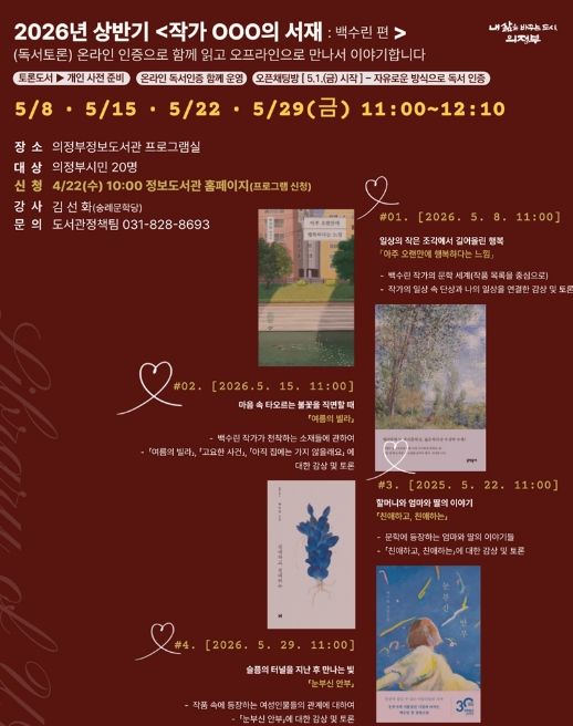 (비전21뉴스) 의정부시는 2026년 상반기 ‘작가 OOO의 서재: 백수린 편’을 5월 매주 금요일(8일, 15일, 22일, 29일) 총 4회에 걸쳐 의정부정보도서관에서 운영한다.