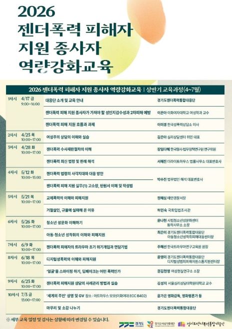 (비전21뉴스) 경기도와 경기도젠더폭력통합대응단이 17일 도내 젠더폭력 피해 지원 현장 종사자들의 전문성 향상을 위한 ‘2026 역량강화 교육’ 상반기 과정을 시작하며 현장 대응력 강화에 나섰다.