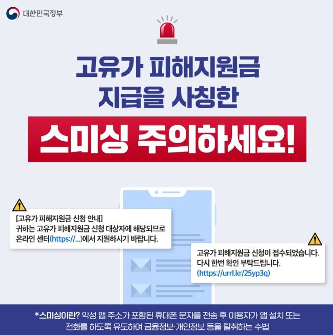 지원금 지급 시기에는 ‘지원 대상자 선정’, ‘고유가 지원금 수령 안내’ 등 신청을 유도하는 가짜 문자가 기승을 부린다. 이러한 문자에 포함된 인터넷 주소(URL)을 클릭하면 악성 앱이 설치되어 스마트폰 내 개인정보나 금융정보가 탈취될 위험이 크다.