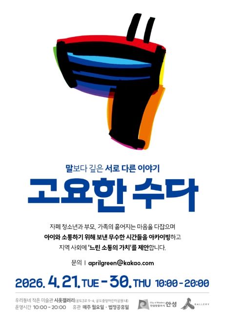 (비전21뉴스) 안성시 시옷갤러리는 오는 4월 21일부터 4월 30일까지 자폐 청소년과 그 가족이 함께 참여하는 전시 《고요한 수다》를 개최한다고 밝혔다.