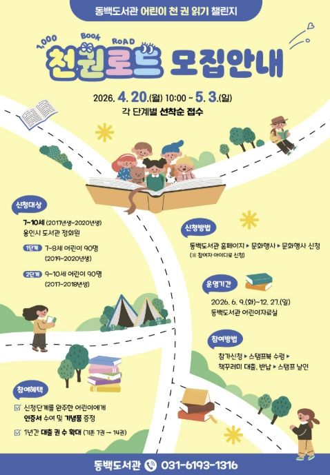 (비전21뉴스) 용인특례시 동백도서관은 어린이 천 권 읽기 챌린지 ‘천권로드(ROAD)’ 참여자를 모집한다고 20일 밝혔다.