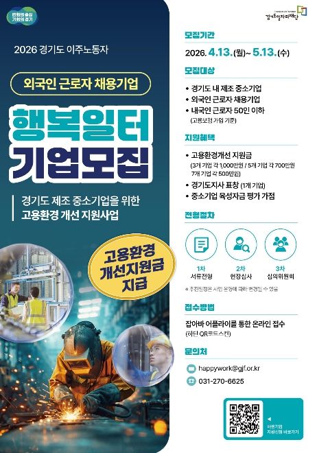 (비전21뉴스) 경기도와 경기도일자리재단은 도내 외국인 근로자를 고용한 중소 제조기업을 대상으로 ‘2026년 경기도 이주노동자 행복일터 선정사업’ 참여기업을 모집한다고 20일 밝혔다.