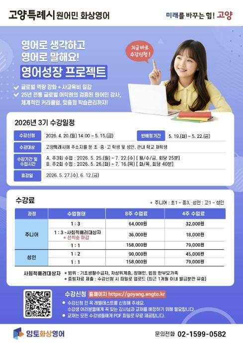 (비전21뉴스) 고양특례시는 글로벌 역량 강화와 사교육비 부담 완화를 위한 ‘원어민 화상영어’ 프로그램의 3기 수강생을 4월 20일부터 5월 15일까지 모집한다.