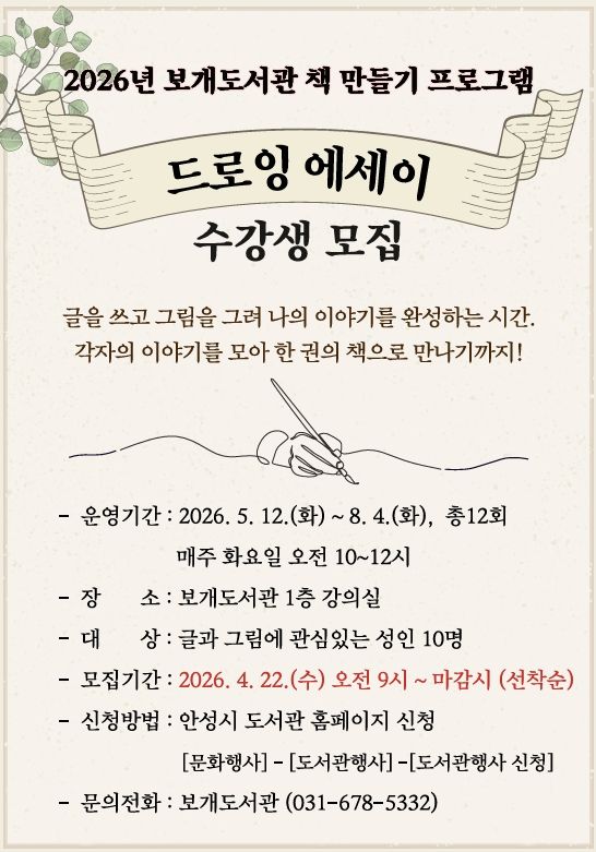 (비전21뉴스) 안성시 보개도서관(책문화센터)이 시민들의 창작 활동을 지원하고 일상 속 예술 경험을 확대하기 위해 오는 5월부터 ‘드로잉 에세이’와 ‘포토 에세이’ 책 만들기 프로그램을 새롭게 운영한다고 밝혔다.