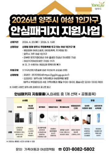 (비전21뉴스) 양주시는 관내 여성 1인 가구 등 범죄 취약 여성 가구의 안전한 일상을 지원하기 위해 ‘2026년 양주시 여성 1인 가구 안심패키지 지원사업’을 추진한다.