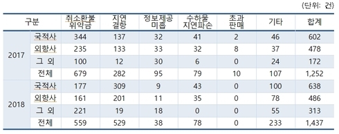 2018년 한국소비자원에 접수된 항공 관련 피해구제 접수건수는 1,437건으로 여객의 증가세와 함께 전년 대비 증가했다.