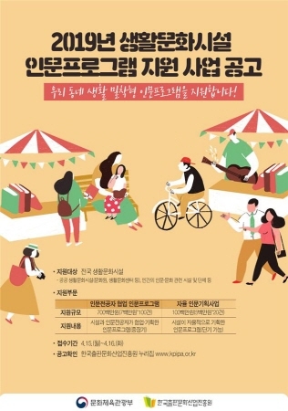 [비전21뉴스] 문화체육관광부는 한국출판문화산업진흥원과 함께 ‘생활문화시설 인문프로그램 지원 사업’에 참여할 기관을 오는 4월 16일까지 공개 모집한다.