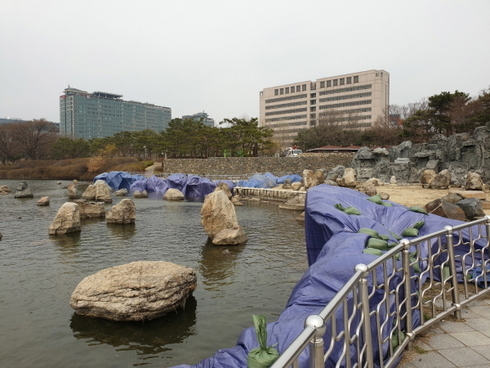 [비전21뉴스] 고양시는 최근 호수공원 인공폭포의 유리섬유 논란과 관련해 호수공원 이용객들의 불안감을 최소화하기 위한 긴급처방으로 유리섬유가 떨어져 나오는 인공암을 비닐로 덮어 외부 공기로부터 차단하고 정상운영을 위한 대책을 수립하고 있다.