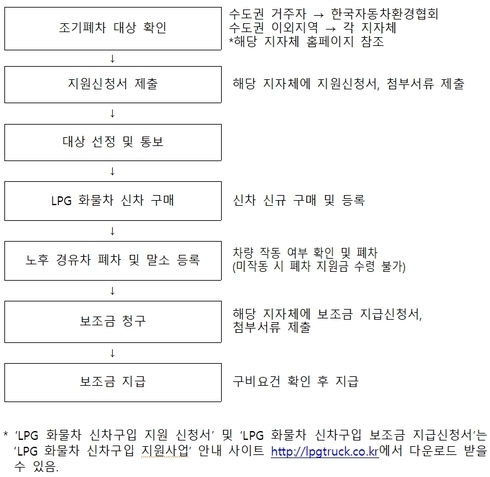 지원대상은 노후 경유차를 조기폐차한 후, 신차로 LPG 1톤 화물차를 구입하는 차량 소유자 또는 기관이며, 저소득층·장애인 등 취약계층의 경우 우선적으로 지원한다. 신차구입 지원대상자로 선정되면 조기폐차 보조금 외에 추가로 400만 원을 지원받는다.