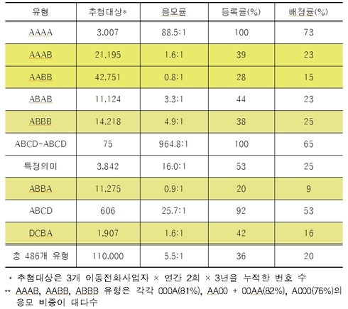 아울러, 지난 3년간의 추첨결과를 분석해 응모 및 배정률이 낮은 번호는 제외해, 추첨대상을 486개 유형에서 155개로 축소함으로써 당첨이 되어도 배정이 안 되는 번호를 최소화하고 번호자원을 효율적으로 이용할 수 있도록 했다.