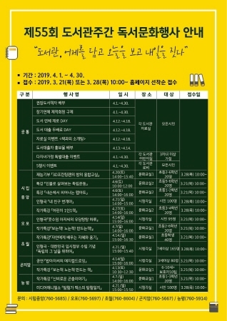 올해 제55회를 맞아 광주시 관내 5개 공공도서관은 ‘도서관, 어제를 담고 오늘을 보고 내일을 짓다’라는 주제로 관련 행사를 운영한다.