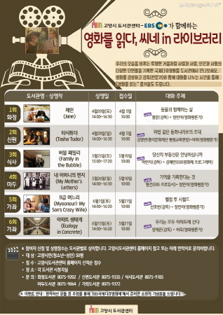 첫 회는 4월 5일부터 접수를 받아 4월 20일에 화정도서관 시청각실에서 상영할 예정이며 접수는 고양시도서관센터 홈페이지에서 가능하다.