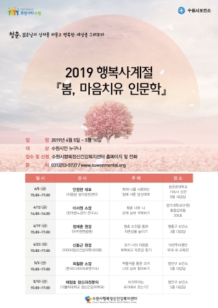 [비전21뉴스] 수원시행복정신건강복지센터가 4월부터 오는 5월 청춘을 위로하는 인문학 강연 ‘2019 행복사계절 봄, 찾아가는 행복인문학’을 연다.