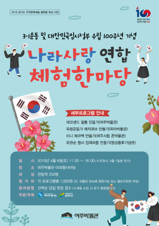 이번 행사는 ‘경기도 지역문화예술 플랫폼 육성사업’의 일환으로 여주시 공사립 박물관 4곳이 3.1운동 및 대한민국임시정부 수립 100주년을 기념하며 각 박물관에서 준비한 특색 있는 프로그램을 한자리에서 체험할 수 있도록 마련됐다.. 아울러, 여주지역의 다양한 박물관의 전시 및 교육을 홍보할 예정이다.