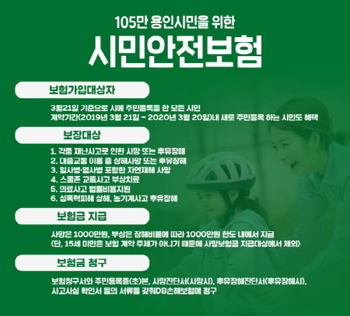 백군기 용인시장은 “시민안전보험은 시민들이 갑작스런 사고나 재난을 당했을 때 최소한의 안전망을 보장받을 수 있도록 시행하는 것”이라며 “앞으로도 시민들의 안전을 지키기 위해 최선을 다하겠다”고 말했다.
