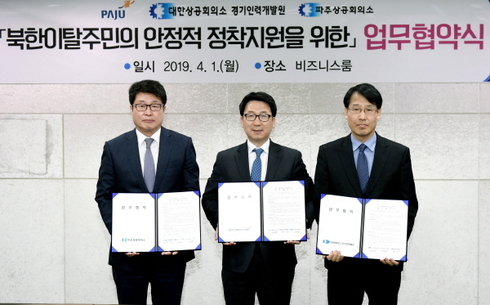 [비전21뉴스] 파주시는 1일 파주시청 비즈니스룸에서 대한상공회의소 경기인력개발원, 파주상공회의소와 북한이탈주민의 안정적인 정착을 위한 업무협약식을 가졌다.
