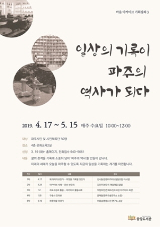 올해 프로그램은 ‘일상의 기록이 파주의 역사가 되다’를 주제로 무엇을 기록할 것인가?, 아카이브 사례, 자료수집과 활용, 구술사 인터뷰, 파주마을 이야기 등 아카이브 전문가 강의를 준비했다. 평소 아카이브에 관심이 있었던 시민이 참여하면 많은 도움이 될 것으로 보이며 강좌가 끝난 후 희망자에 한해 중앙도서관 시민 채록단으로 활동할 수 있다.