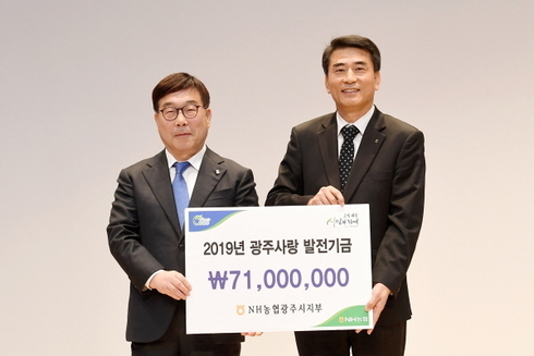 [비전21뉴스] NH농협은행 광주시지부는 지난 1일 광주시청 대회의실에서 열린 직원 월례회의에서 지난 한 해 동안 광주시민, 공직자 등이 적립한 제휴카드 적립기금 7천100만원을 광주시에 전달했다.