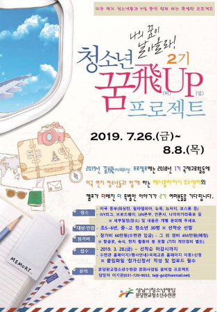 오는 7월 26일부터 8월 8일 12박 14일 일정으로 진행되는 ‘2019 청소년 꿈飛UP 프로젝트’는 초등 5학년과 6학년, 중고등 대상 청소년 30명이며, 지난 3월 28일부터 선착순 모집 중이다.