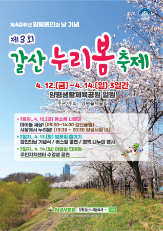 [비전21뉴스] 오는 12일부터 14일까지 3일간 양평 생활체육공원 일원에서 ‘제3회 갈산 누리봄 축제’가 열린다.
