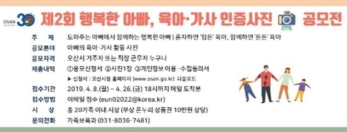 이번 제2회 행복한 아빠, 육아·가사 공모전은 오는 8일부터 26일까지 접수할 예정이며, 특별한 형식은 없고 아빠의 육아모습이나 가사활동을 담은 사진이면 가능하다. 오산시에 거주하거나 오산시 소재 직장 근무자라면 누구나 참여할 수 있다.
